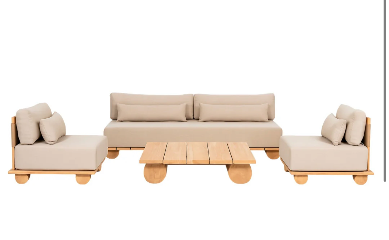 Natural wood seating set with beige cushions,